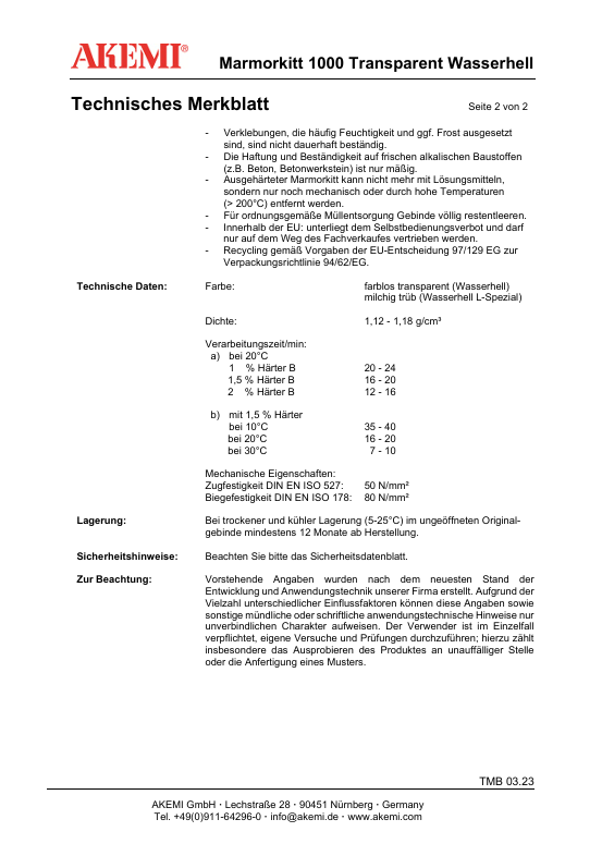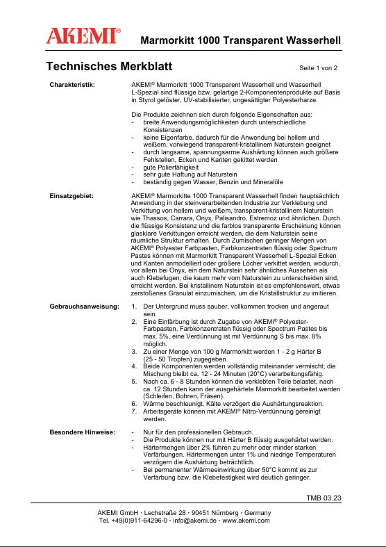 Produktinformationen "Akemi Marmorkitt 1000 Transparent L-Spezial Wasserhell 900ml 10722"